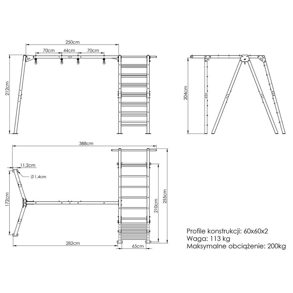 Den robuste ramme, fremstillet af stålprofiler med dimensionerne 60x60x2 mm, kan bære op til 200 kg. Pulverlakeringen beskytter mod vejrpåvirkninger og mekanisk slid, hvilket sikrer langvarig holdbarhed. Den åbne vinkel mellem tværstangen og benene forbedrer stabiliteten, mens huller i fødderne muliggør sikker forankring i jorden.