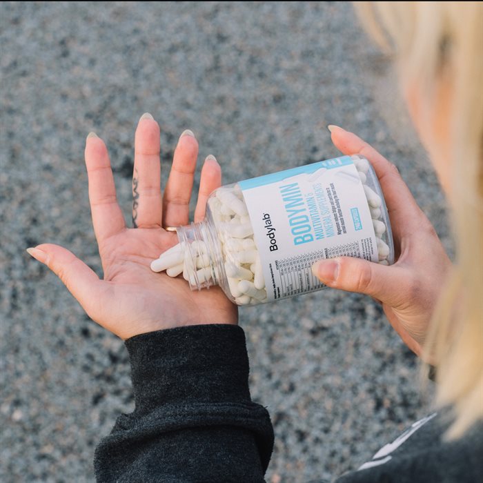 Så hvis du vil sørge for at være godt dækket ind på de fleste vitaminer og mineraler – og slippe for at tage flere forskellige piller – er vores multivitamin en rigtig god løsning. Bodymin indeholder nemlig 22 forskellige vitaminer og mineraler, herunder C, B12, D, zink og magnesium.