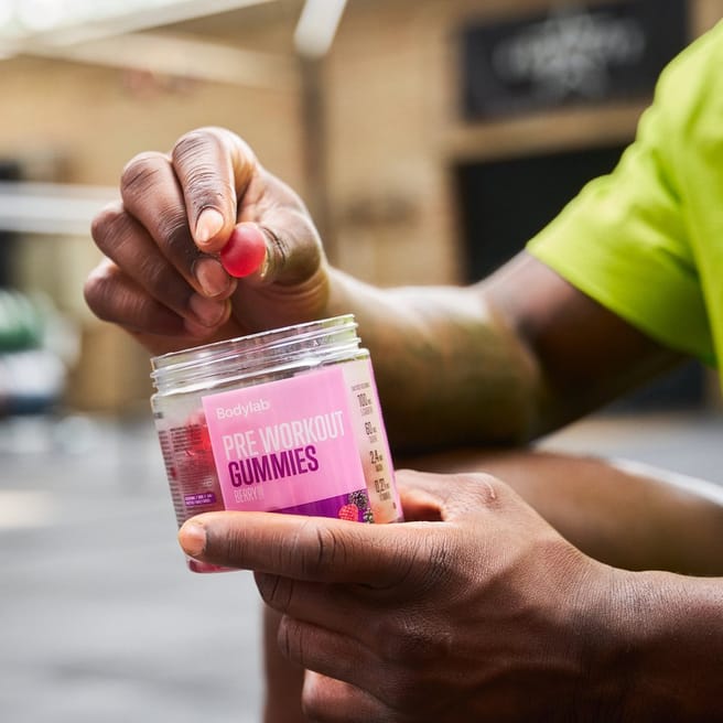 Vores Pre Workout Gummies er spækket med taurin, B6, niacin og l-carnitin – en kombi, der hjælper med at reducere træthed og udmattelse* lige dér, hvor du plejer at mærke det: inden du overhovedet er gået i gang med din træning. Bodylab Pre Workout Gummies er præcist doseret, nemme at tage med og smager så godt, at du næsten glemmer, det er sportsernæring. Du spiser bare tre gummies 15-30 minutter inden træning, og så er du klar. Ingen shakere. Ingen scoops. Ingen poser. Bare masser af stimulerende ingredienser og en lækker frugtig smag. Vi kalder det treats with benefits.