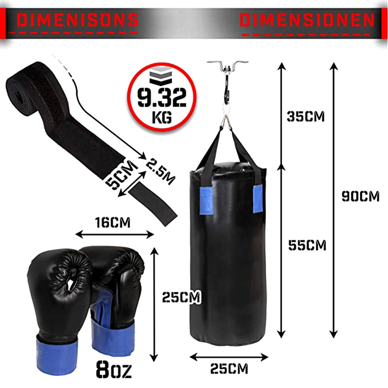 Selve boksepuden har en højde på 55 cm, men når den er monteret inklusive ophænget, når den op på omkring 90 cm. Den har en vægt på ca. 10 kg og en diameter på 25 cm. Boksehandskerne, der følger med, har en størrelse på 8 oz og inkluderer båndager med mål på 5 cm x 2,5 m.