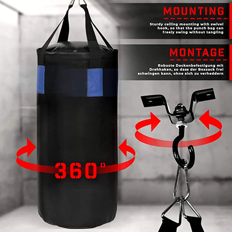 Det medfølgende ophængssystem sikrer, at boksepuden kan monteres sikkert og pålideligt. Med loftmontering og karabinhager er det nemt at opsætte og justere efter behov.