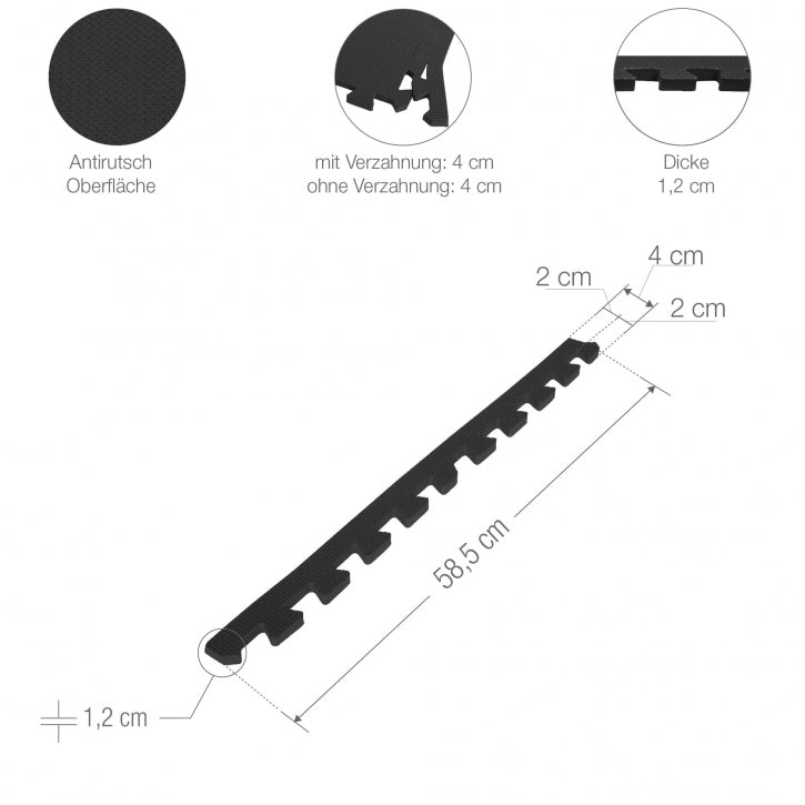 Med dimensioner på 62,5 cm x 62,5 cm og en tykkelse på 1,2 cm giver dette fitnessgulv den perfekte base til dine træningsaktiviteter. Uanset om du laver Styrketræning, yoga eller legende aktiviteter med dine børn, vil dette gulv give den nødvendige støtte og beskyttelse.