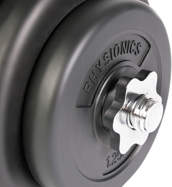 Grebsområdet på ca. 14,5 cm er riflet for at sikre et skridsikkert og komfortabelt greb, hvilket gør det nemt at holde fokus på træningen uden at bekymre sig om, at hænderne glider. Stængerne er udstyret med trapezgevind og stjernelåse, som sørger for, at vægtskiverne altid sidder sikkert og stabilt på plads.