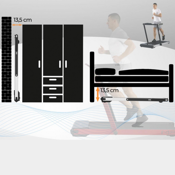 Når det er foldet sammen, kan løbebåndet opbevares på højkant eller placeres under sengen, takket være kompakte dimensioner på 158x77x13,5 cm.