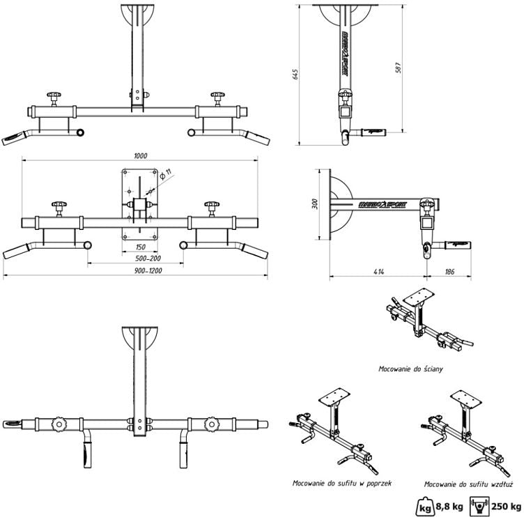Med en imponerende belastningskapacitet på 250 kg kan du træne med tillid, uanset dit træningsniveau. Den justerbare bredde på stangen fra 90 cm til 120 cm og de justerbare håndtag fra 20 cm til 50 cm i indermål eller fra 90 cm til 120 cm i ydermål gør det muligt for brugere med forskellige kropsstørrelser og træningsbehov at drage fordel af dette træningsredskab.