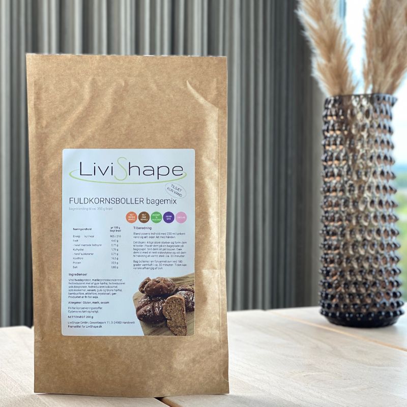 LiviShape FULDKORNSBOLLER bagemix er fri for soja og konserveringsstoffer. Velegnet til vegetarer.
