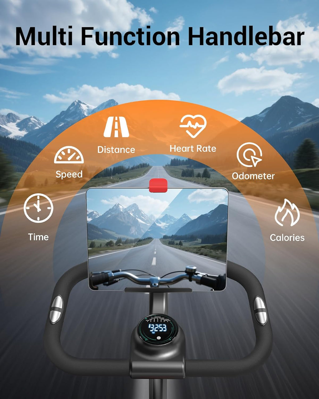 Ekstra polstret ventileret sæde: Oplev uovertruffen komfort med vores brede, polstrede og ventilerede sportsæde designet til optimal støtte. Dens ekstra polstring og de ventilerede zoner sikrer luftgennemstrømning, reducerer sveddannelse og holder dig afkølet under intense træningspas. De to gummistøtter forbedrer stødabsorbering for en mere jævn og behagelig cykeltur.
