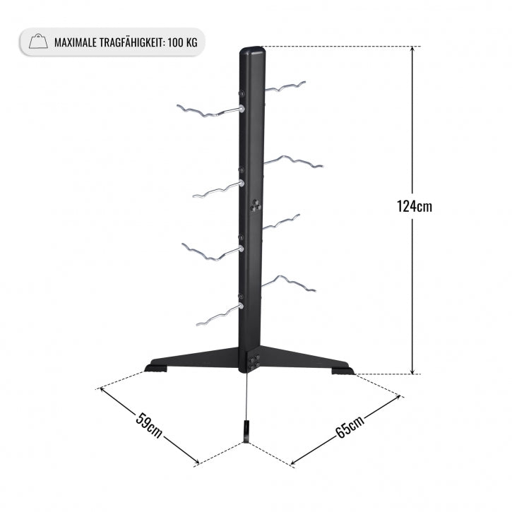 Med 8 holdere til forskellige greb tilbyder denne stander en løsning på rodet og besværet ved at holde styr på dine træningsredskaber. Ud af dens 8 holdere er de buede 23 cm lange og de lige er 24,5 cm lange.