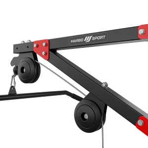 MH-W108 trækstationen til vægmontering byder på en solid konstruktion med pulverlakerede metalelementer og bolte og skruer beskyttet af gummihætter for ekstra sikkerhed. Den giver mulighed for udføre en lang række øvelser, som kan tilpasses individuelle træningsbehov og mål.