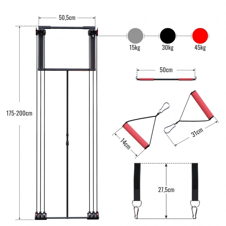 Modstanden er justerbar ved hjælp af elastikbånd i forskellige farver (Grå 15 kg, sort 30 kg og rød 45 kg modstand) hvilket gør det nemt at tilpasse træningen til din styrke og evne.