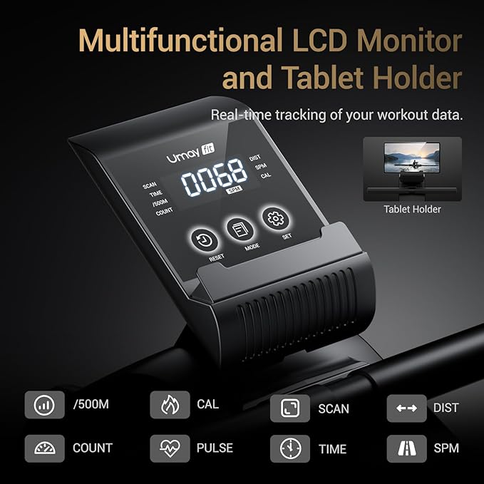 Det multifunktionelle LCD-display viser tid, distance, antal tag og forbrændte kalorier i realtid, mens den indbyggede tablet-holder gør det muligt at se serier, lytte til musik eller følge online-træningsprogrammer, mens du ror.