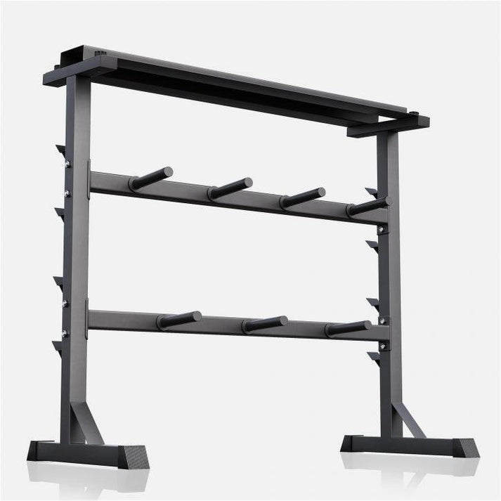 Stativets konstruktion i højkvalitets firkantet stål sikrer holdbarhed og stabilitet, hvilket betyder, at det kan modstå intensiv daglig brug uden problemer. De syv separate skiveholdere og de fire vægtstangsholdere er designet til at rumme en bred vifte af udstyr, hvilket gør det til en alsidig løsning for ethvert homegym.