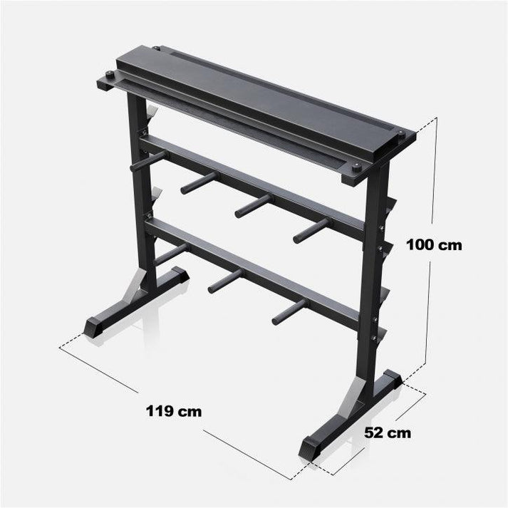 Med en maksimal belastning på 200 kg for den øverste hylde og 100 kg pr. holder er dette stativ designet til at håndtere selv de mest krævende træningsmiljøer. Dimensionerne på 119 x 52 x 100 cm gør det kompakt nok til at passe ind i forskellige rum uden at gå på kompromis med opbevaringskapaciteten.