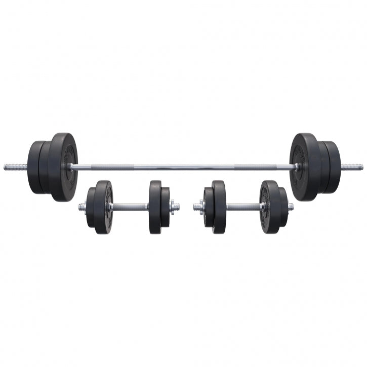 Hele sættet vejer i alt 70 kg inklusiv vægtstængerne. Et super godt sæt til de der ikke smider rundt med vægtene og gerne vil have et billigt komplet vægtsæt til hjemmetræning.
