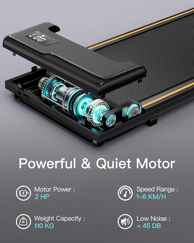 Dette walking pad er udstyret med en holdbar motor med 2,25HK (1650W), der har en levetid på over 3500 timer og en støjniveau på mindre end 45 decibel. Dette sikrer, at din træning ikke forstyrrer din familie eller naboer.